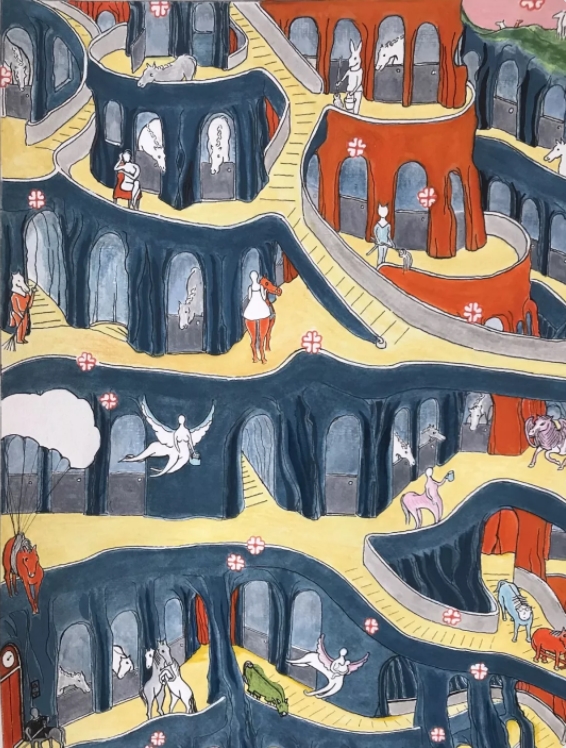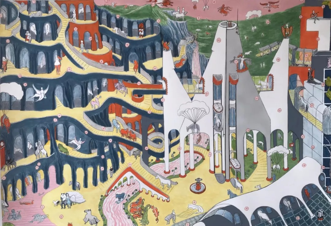 畫中不少形象,出自《山海經(jīng)》、西漢織物殘片及古墓、中世紀的壁畫。桃花,也就是我們打開微信“生日快樂”,紛紛揚揚落下來的那種效果,使現(xiàn)場變得更真實、更生動。