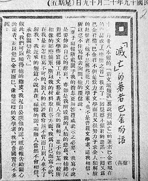 《福報(bào)》發(fā)表署名“聲燕”的短文《〈滅亡〉的著者巴金的話》
