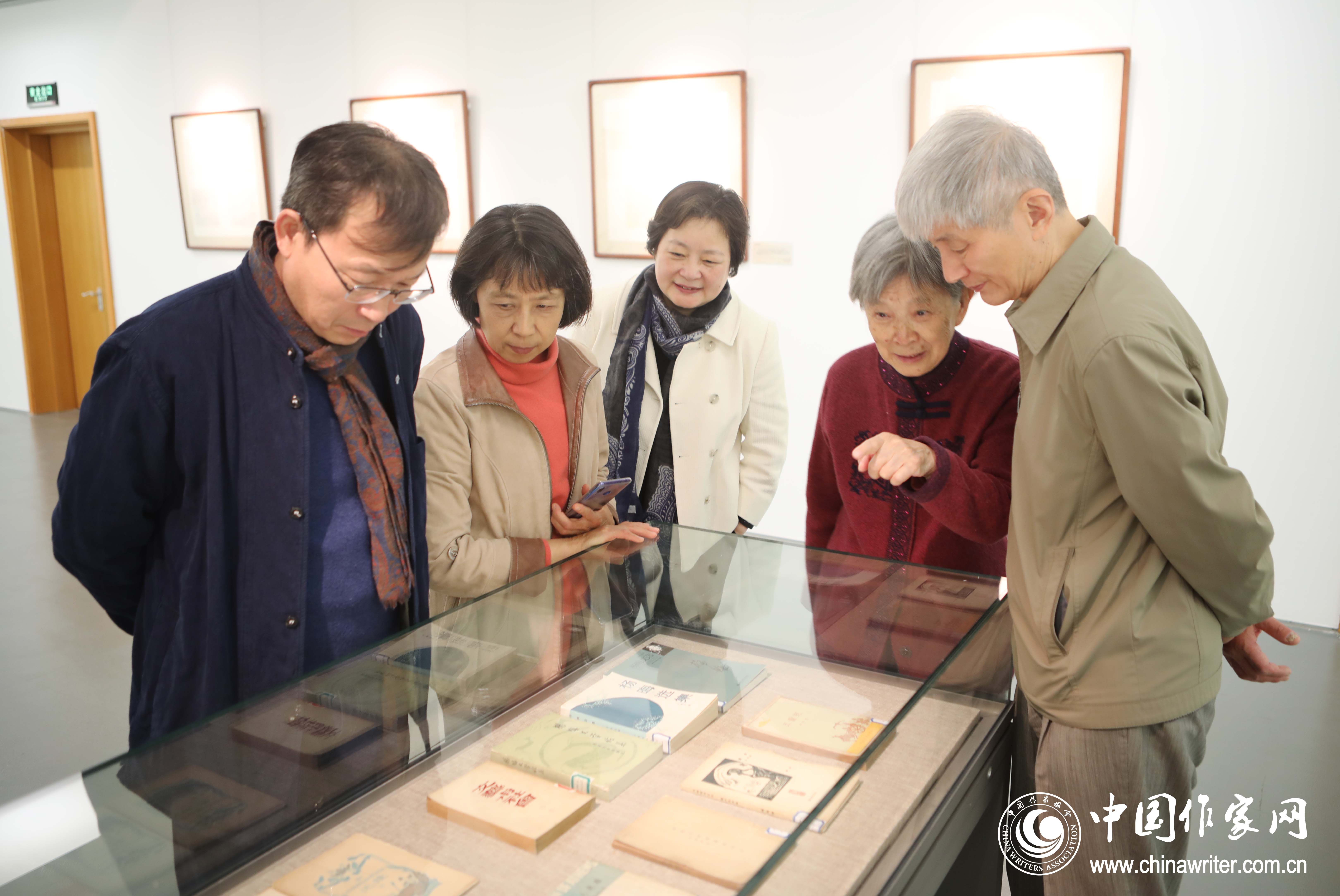 中國現(xiàn)代文學(xué)館副館長李榮飛(左一)、征集編目部主任計(jì)蕾(左三)與楊晦先生子女共同閱讀楊晦先生著作及所編刊物