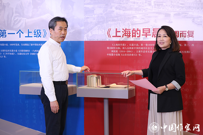 北京第二外國(guó)語(yǔ)學(xué)院教授、評(píng)論家李林榮(左)點(diǎn)評(píng)周而復(fù)的《上海的早晨》