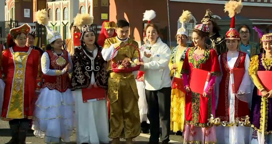 新疆塔城的少數(shù)民族朋友一同朗誦起《天山牧歌》中的《賽馬》