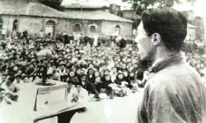 不僅政治演說,聞一多的學(xué)術(shù)演說同樣很吸引人。1942年11月6日,聞一多在西南聯(lián)大講“伏羲的傳說”。講這樣的題目也能吸引那么多聽眾,這才叫本事。朱自清在當(dāng)天的日記中感嘆:“晚間聽一多演講,妙極,非常羨慕他,聽眾冒雨而來,擠滿教室?!保ㄒ姟吨熳郧逦募返?0卷)晚年的聞一多,被朋友們看成是“少有的天才的宣傳鼓動(dòng)家”(參見費(fèi)孝通《難得難忘的良師益友》);而有聞一多出席的場合,“聽眾總是五六千至二三萬人,演講時(shí)總是掌聲不絕”(參見張友漁《斗爭才能生存,退縮便是罪惡》)。仔細(xì)辨認(rèn)聞一多演說照片,講臺上是有麥克風(fēng),可要讓廣場上數(shù)千乃至上萬聽眾 “掌聲不斷”,除了政治激情,還得有很好的演說技巧。就像吳晗《〈聞一多全集〉跋》說的,“他在晚年的若干次著名的講演,都已收進(jìn)了這集子里了。雖然已經(jīng)變成了文字,那聲調(diào),那情態(tài),無法記錄下來”,我們只能根據(jù)回憶錄等歷史資料懸想與重構(gòu)。