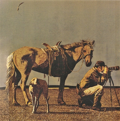 胡日查的套色凸版作品《聽見草原——聚焦》不但為自己涂抹了生命的底色,也開闊了表現(xiàn)的視野。站立的馬,蹲坐的人,嚎叫的狗,盤旋的鷹,構成了草原悠遠的意境。從馬的回首到狗的昂頭,再到人的遠眺,作者巧妙地將視覺焦點轉移至相機的長焦鏡頭上。畫面凝聚了主題,視覺引發(fā)著聽覺,濃縮的景象釋放出想象,讓觀者在虛實間徜徉慢步,讓意圖在想象中合成。一列飛馳的機車橫貫大地,正欲破圖而出,所謂“聽見草原”即源于此。大地的離離菒草被覆著陽光的暖意,草原的豐富中又添加了機車的鳴響,視覺與聽覺在敘說著時代的變化,韓愈的詩句“鳴笛急吹爭落日,清歌緩送款行人”正是對應了畫面的意境。