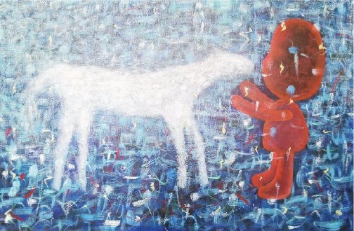 今年恰逢內(nèi)蒙古首屆國(guó)際馬文化博覽會(huì)舉辦,內(nèi)蒙古自治區(qū)上下都在為弘揚(yáng)蒙古馬精神、建設(shè)新時(shí)代的內(nèi)蒙古而殫精竭慮,本次展覽正好契合了這個(gè)主題。什么是蒙古馬精神?我以為就是自強(qiáng)、樂(lè)觀、自由、寬容、腳踏實(shí)地、不畏艱苦、團(tuán)結(jié)奮進(jìn)??v觀展出的作品,我確實(shí)感受到了藝術(shù)家們對(duì)蒙古馬精神的獨(dú)到理解和闡釋。形式上,他們不拘泥于馬的具象化表征,摒棄了模式化的創(chuàng)作思維,而更多的是以或抽象、或卡通、或具有符號(hào)化的,甚至是變形的方法,表現(xiàn)馬的形態(tài)和生命內(nèi)涵,以及馬所象征的人的精神力量。在藝術(shù)手法上他們更是大膽嘗試,不光有油畫、丙烯、水彩、國(guó)畫、木刻、雕塑還有銅版畫以及馬克筆繪制的作品。比如金剛的《鞍馬史詩(shī)》 ,用舊馬車的轅木、舊馬鞍和馬飾以及廢棄的門板組合成馬的幾何形狀,給人一種古樸的空間感和時(shí)間感。吳智彬的《浮城》則以馬克筆細(xì)密的筆觸描繪了一個(gè)既逼真又幻象的超現(xiàn)實(shí)世界。蘇德巴特爾的油畫《戰(zhàn)神》將傳統(tǒng)裝飾與現(xiàn)代卡通融為一體,描摹了以長(zhǎng)生天和戰(zhàn)馬為核心的蒙古精神,極具想象力。青格爾的油畫《蒙古臉譜》給我印象尤為深刻,他以仿蒙古族傳統(tǒng)皮雕的形式,將漫畫和裝飾畫的筆法融入他的構(gòu)圖,那一個(gè)個(gè)擠壓在似煙囪和管道中的臉,隱喻了現(xiàn)代性與游牧文明的沖撞和融合。展覽策展人莫尼的作品也給人與眾不同的感受,他的油畫《沉默的他們》系列作品將代表草原游牧精神的馬與當(dāng)代社會(huì)的眾聲喧嘩進(jìn)行比照,使沉默產(chǎn)生了形而上的寓意。而另一位策展人朝魯?shù)挠彤嫛厄T士》 ,則借鑒了古代壁畫和巖畫的形態(tài),粗糲而富有歷史氣息。孫玉寶的《冬牧》以現(xiàn)代水墨的手法,表現(xiàn)了在嚴(yán)酷的自然環(huán)境中牧人與馬的依存關(guān)系。而錢達(dá)木尼的丙烯《尋· 3》中的馬被賦予了蒙古族人崇尚的藍(lán)色,將馬的姿態(tài)、節(jié)奏與大自然的絢爛融為一體,具有很強(qiáng)的表現(xiàn)主義風(fēng)格。靳雙雙的油畫《花花世界的幻想》則是一個(gè)“90后”城市女孩對(duì)馬和牛的奇妙的想象,畫面清新、淡雅,有水彩般的透明感。此外,油畫或丙烯類還有芬筍得日的《無(wú)聲的自述》 、李旭東的《晨曲》 、旭日花的《草原印象》 、白嘎力的《浮影》 、孟和琪琪格的《靜謐》 、蘇龍嘎的《夢(mèng)》 、旭日嘎的《15℃》以及段琦琦的《同在》 ;國(guó)畫有海日汗的《天靈》 、敖寶林的《鬃飛》 、孟和烏力吉的《藍(lán)騎士》 ;雕塑有薩其日拉圖的《牧馬人系列:初戀》 、高貝的《敕勒川印象》 、岳布仁的《草原戀》 ;水彩有那日蘇的《風(fēng)馬》 ;版畫有伊蘭納的A t T h a t M o m e n t等,這次展覽既以“80后” “90后”為主體,又以上世紀(jì)五六七十年代出生的藝術(shù)家為先導(dǎo),形式多種多樣,內(nèi)容豐富多彩,受到社會(huì)各界的關(guān)注和好評(píng)。
