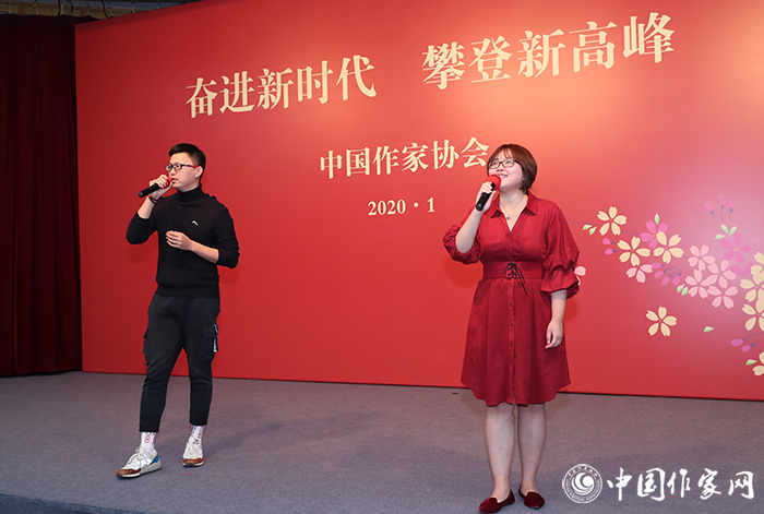 中國(guó)現(xiàn)代文學(xué)館多功能廳張燈結(jié)彩,溫暖如春。舞臺(tái)上的紅色布景和“奮進(jìn)新時(shí)代攀登新高峰”大字分外醒目,傳遞著喜慶祥和的節(jié)日氣氛。
