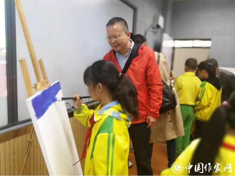 吳斌在東鄉(xiāng)縣幸福學(xué)校觀看小學(xué)生在廈大楊教授的指導(dǎo)下學(xué)繪油畫(huà)