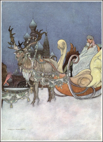 以前介紹過查爾斯·羅賓遜為莎士比亞十四行詩所作的插圖。倫敦的達(dá)克華斯出版公司,在二十世紀(jì)上半葉以善于發(fā)掘優(yōu)秀的文學(xué)作品而蜚聲英美。1913年,他們聘請(qǐng)羅賓遜為一部限量發(fā)行的王爾德童話集創(chuàng)作了一整套插圖,初版只出售兩百五十部,不過后來曾多次重印。這幅彩色插圖,將故事的開頭描摹得惟妙惟肖:公主坐著六匹馴鹿拉的雪橇從芬蘭來出嫁:“雪橇的形狀像一只金色的大天鵝。小公主本人就坐在天鵝的兩只翅膀中間。她那件白鼬皮的長披風(fēng)覆蓋到她的腳下,頭上戴了一頂銀色織物做的小帽子,臉色蒼白得就像她向來所居住著的雪宮的顏色。”