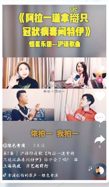 本地話是最容易走通人心的語言。在金山,歡笑主播以當?shù)卦挻钆涫终Z,用金山區(qū)居民最親切的語言為防疫抗疫工作鼓勁。在青浦,恒星樂團的幾位年輕人創(chuàng)作了一支滬語歌曲《阿拉一道拿搿只冠狀病毒悶特伊》,亦莊亦諧的氛圍下,道出全民參與疫情防控的心聲與要點。王淵超已是滬上頗有名氣的音樂人,近年來,他原創(chuàng)的滬語歌曲在全年齡段市民里傳唱甚廣。