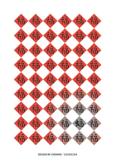 《食蝠毀幸福》是一幅呼吁飲食安全的海報(bào)。來自清華大學(xué)美術(shù)學(xué)院的陳默在創(chuàng)作該作品時(shí)巧妙地利用了中國(guó)文字的構(gòu)造和變化。畫面中,呈陣列排布的紅底“?!弊挚瓷先ハ矚庋笱螅屑?xì)觀看會(huì)發(fā)現(xiàn)有一張“蝠”字混在其中,如病毒傳染一般將它周圍的紅色“?!弊肿?yōu)榘档幕疑渚疽饬x不言而喻。