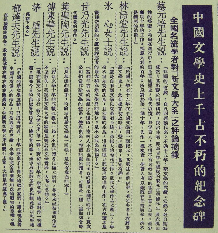 所謂“全國名流學(xué)者對《新文學(xué)大系》之評論摘錄”,總共八則,其中蔡元培、茅盾、郁達夫三則乃下面所刊“總序節(jié)要”或“編選感想”的摘引,剩下的五則是: