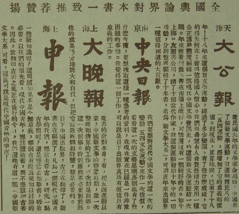 傅東華先生說:“將新文學(xué)十年的成績總匯在一起,不但給讀者以極大便利,并使未經(jīng)結(jié)集的作品不至散失,我認(rèn)為文學(xué)大系的編輯是對于新文學(xué)發(fā)展,大有功勞的。”