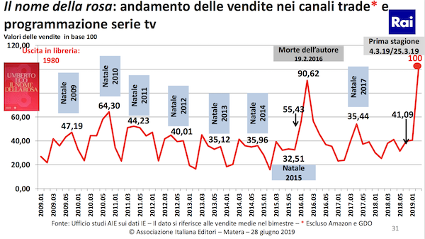 意大利出版社協(xié)會(huì)的數(shù)據(jù)是多方位的,有意思的是,協(xié)會(huì)還列出了書籍周邊市場。比如,以翁貝托·埃科的名著《玫瑰的名字》(或譯《玫瑰之名》)而言,協(xié)會(huì)給出了該書從2009年至2019年3月的銷售波動(dòng)數(shù)據(jù),以2019年3月的銷量為基準(zhǔn)值100: