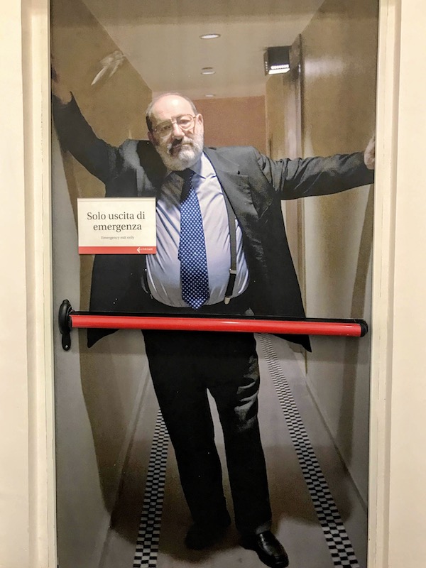 佩魯賈的la Feltrinelli書店中一景:緊急出口上貼著翁貝托·??频木尴?,并寫著:“只有緊急情況才能離開”,似乎暗指:若無急事(哪怕疫情來臨?),請(qǐng)勿離開閱讀的世界。? 周之桓