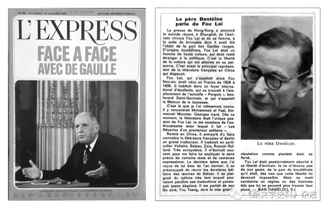 為了解決疑問,首先要厘清他的歐洲經(jīng)歷。沒有想到最早找到的法國資料竟然是一篇悼文,標(biāo)題《達(dá)尼埃魯神甫談傅雷》(Le père Daniélou parle de Fou La?),發(fā)表在《快訊》(L'Express)周刊1966年10月31日第802期: