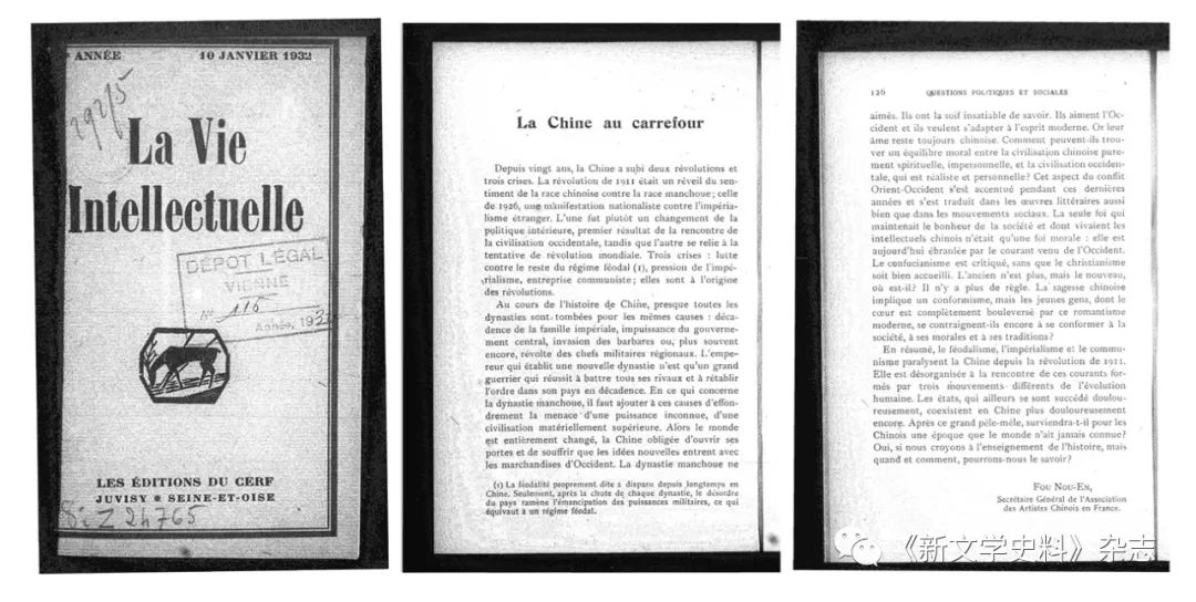 雜志的開本不算大,跟普通圖書差不多,傅雷的文章占去20頁。標(biāo)題很形象,《十字路口的中國》(La Chine au carrefour),作者身份“中華留法藝術(shù)協(xié)會秘書”。編輯為他的文章撰寫了一段提要: