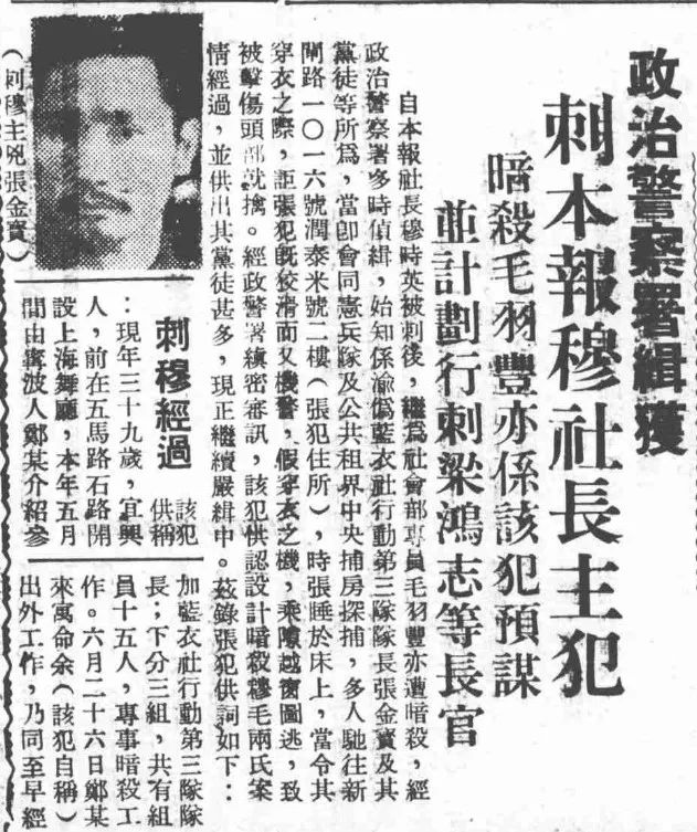 自本報(bào)社長穆時(shí)英被刺后,繼為社會(huì)部專員毛羽豐亦遭暗殺,經(jīng)政治警察署多時(shí)偵緝,始知系渝偽藍(lán)衣社行動(dòng)第三隊(duì)隊(duì)長張金寶及其黨徒等所為,當(dāng)即會(huì)同憲兵隊(duì)及公共租界中央捕房探捕,多人馳往新閘路一〇一六號(hào)潤泰米號(hào)二樓(張犯住所),時(shí)張睡于床上,當(dāng)令其穿衣之際,詎張犯既狡猾而又機(jī)警,假穿衣之際,乘隙越窗圖逃,致被擊傷頭部被擒。經(jīng)政署縝密審訊,該犯供認(rèn)設(shè)計(jì)暗殺穆毛兩氏案情經(jīng)過,并供出其黨徒甚多,現(xiàn)正繼續(xù)嚴(yán)緝中。茲錄張犯供詞如下: