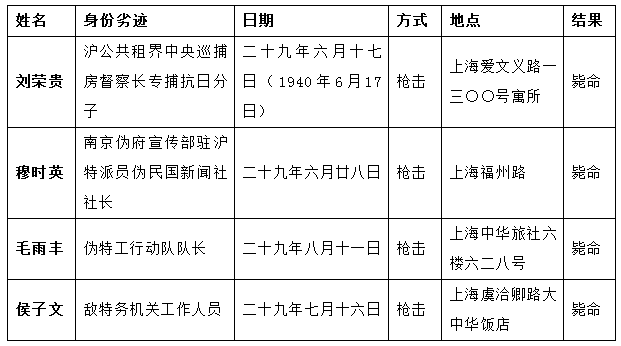 此外,《忠義救國軍志》也記載了抗戰(zhàn)爆發(fā)前后,軍統(tǒng)“總指揮部”、各區(qū)(站)、各“行動(dòng)隊(duì)”等各個(gè)單位鋤奸行動(dòng)的具體信息——包括漢奸姓名、身份劣跡,行動(dòng)的單位、日期、手段、地點(diǎn)和結(jié)果等。其中有張金寶所在的軍統(tǒng)“上海直屬行動(dòng)隊(duì)”狙殺劉榮貴、穆時(shí)英、毛雨豐、侯子文等記載,相關(guān)情況見下表。