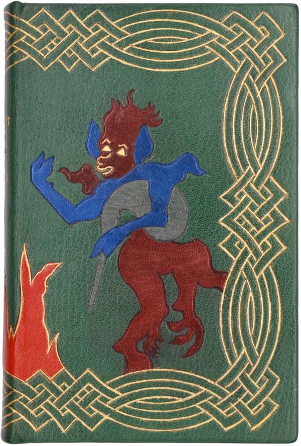 《一個(gè)青年藝術(shù)家的畫像》( A Portrait of the Artist as a Young Man),倫敦:Jonathan Cape Ltd.,1928年六刷(此著初版由倫敦自我主義者出版社于1916年推出)。此冊(cè)為喬伊斯題贈(zèng)本,贈(zèng)言曰:“贈(zèng)George Cosgrove,詹姆斯·喬伊斯,1929年6月5日,巴黎?!迸c《尤利西斯》和《芬尼根守靈夜》均推出喬伊斯簽名限印版不同,此著喬伊斯簽名甚罕見(jiàn)。這是美國(guó)著名裝幀家重新裝幀的作品。綠色哈麥丹山羊皮全皮裝。書封的裝幀設(shè)計(jì)靈感來(lái)自愛(ài)爾蘭中世紀(jì)手稿里首字母的彩飾圖案。燙金印中世紀(jì)凱爾特結(jié)為邊框,框中以彩色鑲皮呈現(xiàn)象征沖動(dòng)的魔鬼和地獄的火焰。包布書匣上是褐色貼皮的都柏林城市天際線。