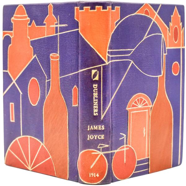 《都柏林人》(Dubliners),倫敦:Grant Richards Ltd.,1914年,初版一刷;印數(shù)一千兩百五十冊(cè)。一千兩百五十冊(cè)中,由Grant Richards書坊先行裝訂七百四十六冊(cè),于1914年6月15日在倫敦首發(fā);其余五百零四冊(cè)海運(yùn)至紐約的B. W. Huebsch書坊,之后于1916年12月15日至1917年1月1日期間在美國(guó)出版。這一冊(cè)是美國(guó)裝幀家使用紫色哈麥丹山羊皮重新裝幀的作品。喬伊斯一輩子酗酒,是個(gè)不折不扣的酒鬼。裝幀元素包括碩大的酒瓶、自行車、屋舍入口處、都柏林教堂,以彩色鑲皮書封詮釋日常生活中的喬伊斯及其與天主教內(nèi)心沖突的現(xiàn)實(shí)?!抖及亓秩恕肥菃桃了乖缙诙唐≌f(shuō)集,從封筆到出版等待了九年。此集中彌漫著的“怪異恐怖的柔情”伴隨了他顛沛的一生。多年的衰敗與經(jīng)濟(jì)的停滯不前,令二十世紀(jì)初的都柏林“癱瘓”為一座生活艱辛、深陷絕望的城市。詩(shī)人葉芝等發(fā)起愛(ài)爾蘭文學(xué)復(fù)興運(yùn)動(dòng),期望通過(guò)新的藝術(shù)作品恢復(fù)愛(ài)爾蘭民俗,以此促進(jìn)民族認(rèn)同。喬伊斯有意回避這一如火如荼的運(yùn)動(dòng),認(rèn)為這一運(yùn)動(dòng)過(guò)于心胸狹窄、粗野偏狹、自我封閉。他堅(jiān)信“文學(xué)的真理”不在于借助往昔經(jīng)過(guò)美化了的鏡頭來(lái)審視愛(ài)爾蘭,而是應(yīng)該像他在《都柏林人》中所做的那樣,以“現(xiàn)實(shí)的”和“無(wú)所畏懼的嚴(yán)苛”來(lái)審視現(xiàn)代愛(ài)爾蘭經(jīng)驗(yàn)。他試圖通過(guò)他“精心擦拭的鏡片”,讓陷于“精神/道德癱瘓”的同胞好好看看他們自己的真實(shí)——“我們愚蠢、滑稽、呆滯、腐敗,但我們?nèi)灾档猛椤?。喬伊斯真正的企圖乃是,借助于《都柏林人》,再次喚醒“愛(ài)爾蘭良知”,從而為“我的國(guó)家?guī)?lái)精神上的解放”。