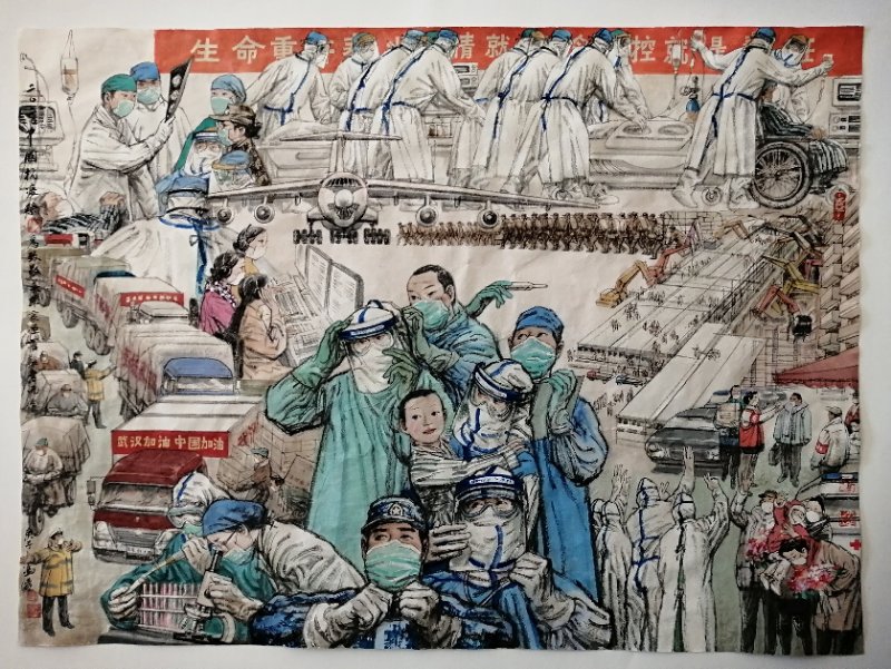 在這場人民戰(zhàn)疫中,全國美術(shù)界也表現(xiàn)出同仇敵愾、全體總動員的熱情和勇氣,從中國美協(xié)到各大美術(shù)學(xué)院,從白發(fā)蒼蒼的老教授,到莘莘學(xué)子,僅中國美協(xié)就收到了4萬多張各類反應(yīng)人民抗疫的美術(shù)創(chuàng)作作品,美術(shù)界還為抗疫捐款、捐物、捐作品拍賣。中國美協(xié)分黨組書記、駐會副主席徐里曾任集美大學(xué)美術(shù)系主任,他說:“在這次全民戰(zhàn)疫中,全體美術(shù)家是好樣的,高校美術(shù)專業(yè)的青年學(xué)子是好樣的,‘90后’的青年美術(shù)家積極響應(yīng)總書記的講話精神,用手中的畫筆、用自己的真誠有力地投身到支持抗疫的斗爭中表達(dá)對抗疫前線聲援、支持。我們看到這個新時代青年藝術(shù)家,用自己的畫筆來記錄這個時代畫卷,在時代的考驗中茁壯成長!總書記的回信對廣大學(xué)生青年的肯定和勉勵,同樣也是對美術(shù)院校青年學(xué)生的激勵。”