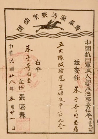 中國(guó)抗日軍政大學(xué)政治對(duì)朱子奇的委任令
