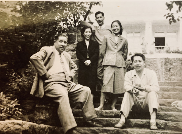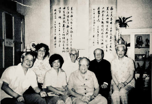 1988年6月19日,愛(ài)潑斯坦(前排右一)和夫人黃浣碧、美國(guó)老友安布德大夫和夫人蘇菲亞、文化部副部長(zhǎng)姚仲明(后右二)和朱子奇、陸璀合影于菊兒小院。