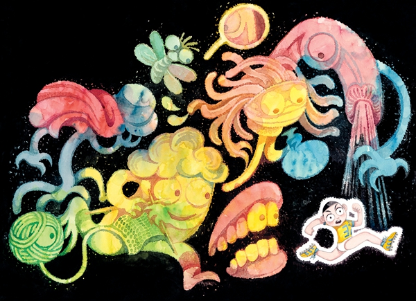 澎湃新聞:這本書里您畫了大量“睡魔怪”的形象,每次出現(xiàn)幾乎都不重復(fù),我覺得比較有意思的是,除了蟲子、雷電這種孩子在生活中比較容易害怕的東西,還有大量像牙膏、花灑、哨子、馬桶、鬧鐘這些看似無害的日用品,有一幅畫面里還出現(xiàn)了奶奶笑呵呵織著毛線的形象。為什么會(huì)這樣設(shè)計(jì)呢?您有參考過類似兒童心理學(xué)之類的專業(yè)材料還是更多地從個(gè)人經(jīng)驗(yàn)或是孩子的講述中取材?