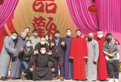 除夕前的最后一場(chǎng)演出,演員們合影時(shí)都戴上了口罩。 均受訪者供圖
