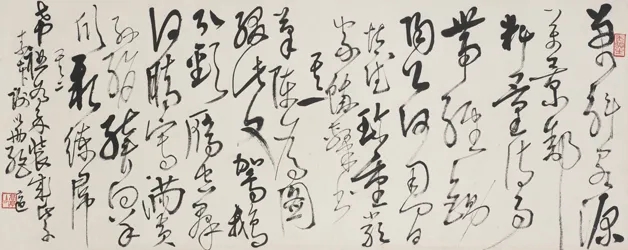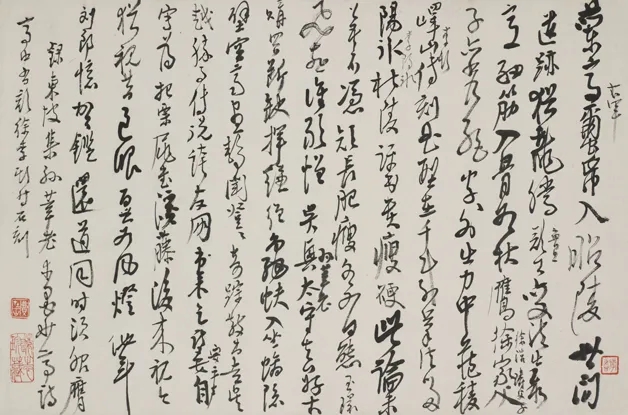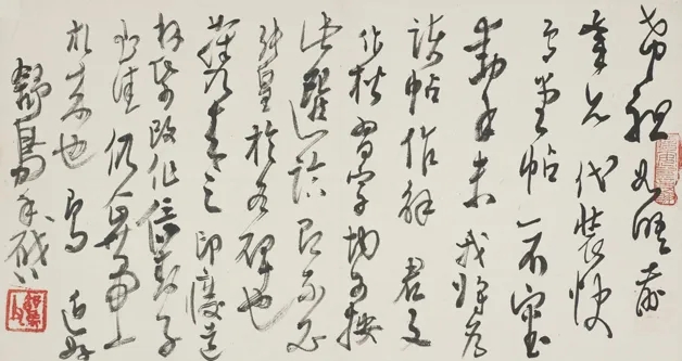 靜靜凝視高二適的書法遺墨,那靈異的墨線,似高猿悲叫,亂水潛奔,這是流淌在古典詩文和經(jīng)典碑帖中的心靈對晤,是意與古會的神異契合。在筆力彌滿、意態(tài)天矯,行氣淋漓的筆勢中透映出一位傳統(tǒng)文人的自我風神。從“赴速急就稱奇觚,鬼哭神驚運思初”的詩句里,流露出他作書時“筆所未到氣已吐”的豪邁心象。高二適的書法意象以氣勢開張、書蘊“詩意”為基調(diào),以其精湛的筆墨古法、深厚淵深的文史修養(yǎng)和特立高潔的文人風骨幻化熔鑄,開古典主義之新境,堪稱傳統(tǒng)書法草書一脈的浪漫主義大師。