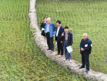 槐樹詩社一行人在田間討論朗誦詩歌。