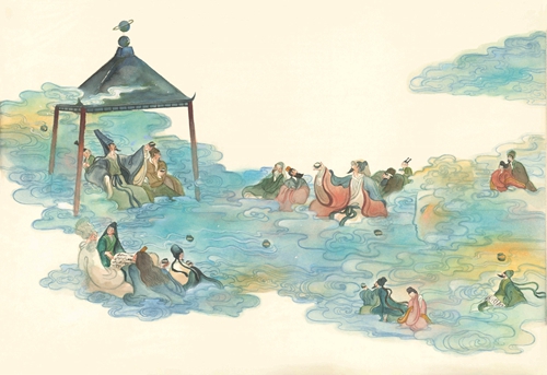 澎湃新聞:如果說《洛神賦》的故事性還比較好的話,那《蘭亭序》就需要構(gòu)建一個(gè)能夠同時(shí)推動(dòng)敘事和繪畫語言的新故事結(jié)構(gòu)去表現(xiàn)了,這個(gè)將水人物化的想法是您還是文字作者的創(chuàng)意?怎么想到要用這樣的方式來講述這個(gè)故事的?