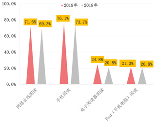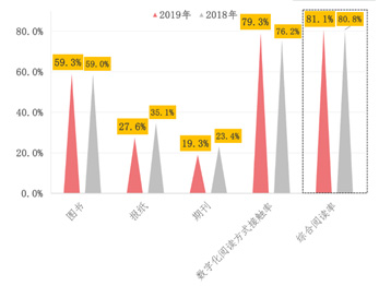 4月20日,中國新聞出版研究院在線發(fā)布“第十七次全國國民閱讀調(diào)查”。調(diào)查發(fā)現(xiàn),2019年我國成年國民包括書報刊和數(shù)字出版物在內(nèi)的各種媒介的綜合閱讀率為81.1%,較2018年的80.8%提升了0.3個百分點。其中,數(shù)字化閱讀方式(網(wǎng)絡在線閱讀、手機閱讀、電子閱讀器閱讀、Pad閱讀等)的接觸率為79.3%,較2018年的76.2%上升了3.1個百分點。