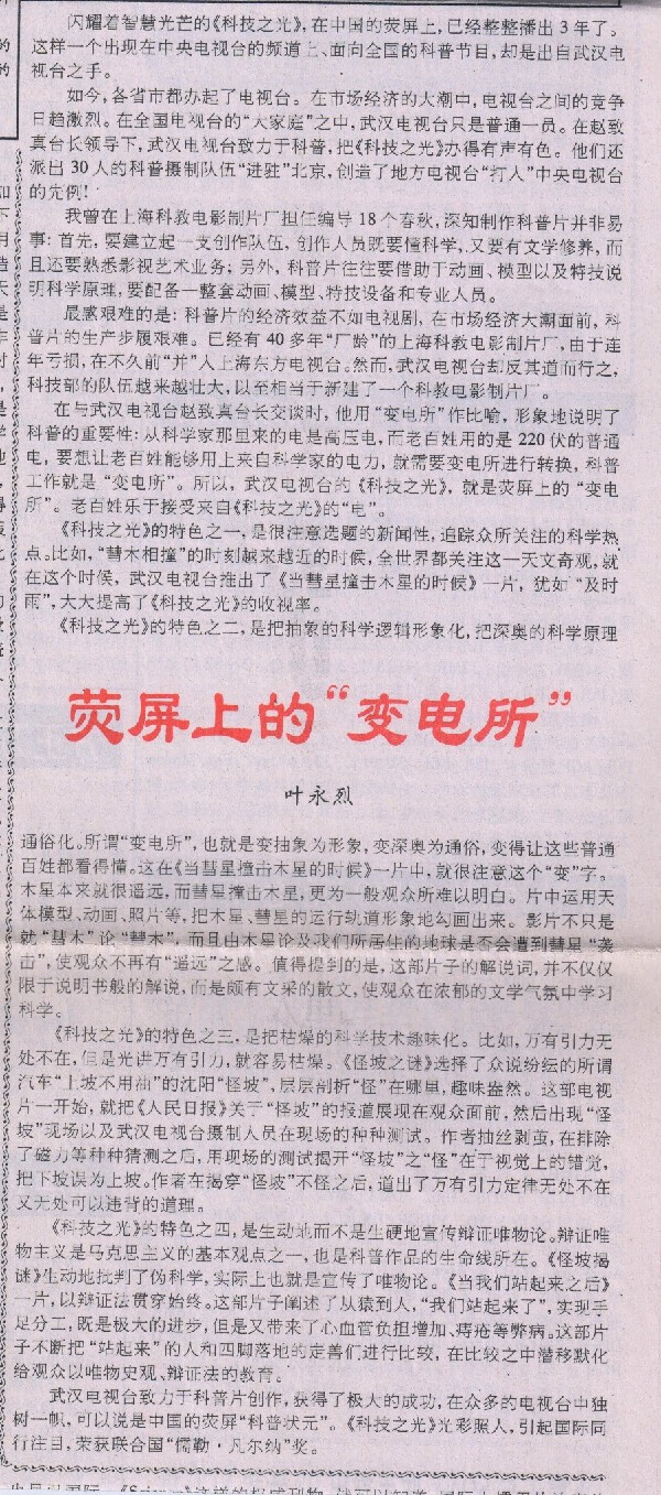 幾天后,葉永烈先生如約寄來了他為《科技之光》播出三周年寫的文章《熒屏上的“變電所”》,發(fā)表在武漢《長江日報》上。葉永烈先生在文中對電視科普的許多見解,今天看來非但不過時,反而更能振聾發(fā)聵。他為人善良謙遜、質(zhì)樸厚道、踐諾守信,從這件小事上可見一斑。