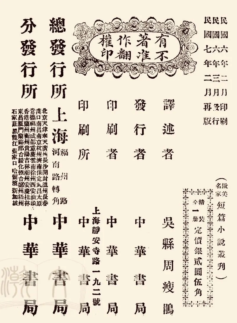 周痩鵑在《我翻譯西方名家短篇小說的回憶》一文中說:“二十二歲時,為了籌措一筆結婚的費用,就把這些年來譯成的西方各國名家短篇小說匯集攏來,又補充了好多篇,共得十四個國家的五十篇作品,定名為‘歐美名家短篇小說叢刻’?!敃r中華書局當局似乎還重視我這部‘歐美名家短篇小說叢刻’,一九一七年二月初版,先出平裝本(三冊),后又出精裝本(一冊),我自己收藏著的,就是這樣一冊精裝本。只因經(jīng)過了四十年,書脊上的隸書金字,已淡至欲無,而淺綠色的布面也著了潮,變了色了?!雹菰撐娜翁峒皶Q《叢刻》,且將初版時間記為1917年2月,筆者認為這可能是初版時間為二月之說的來源。