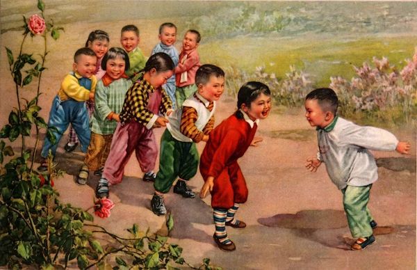通過(guò)兒童題材來(lái)表現(xiàn)社會(huì)政治,反映新中國(guó)新氣象的美術(shù)作品有很多。黃胄1958 年創(chuàng)作的《辦好托兒所 解放婦女勞動(dòng)力》,是表現(xiàn)新中國(guó)新氣象的一件特別的作品,也是黃胄一生中比較特殊的作品?!巴袃核笥讯?,媽媽去生產(chǎn),阿姨照顧我。”畫面中一男一女兩個(gè)孩子騎在木馬上,旁邊有簇?fù)碇耐袃核膬和桶⒁獭D抉R正是當(dāng)年托兒所、幼兒園中最為普遍的玩具。木馬因?yàn)橛谢⌒蔚牡鬃?,坐在上面可以前后晃?dòng),能夠滿足兒童的動(dòng)的需求,也能夠找到騎馬的感覺(jué)。這種表現(xiàn)托兒所與“媽媽去生產(chǎn)”這樣的反映新生活的作品,具有鮮明的時(shí)代特點(diǎn)。李慕白于上個(gè)世紀(jì)的50年代創(chuàng)作的《老鷹捉小雞》,也是以幼兒園為背景來(lái)表現(xiàn)一種最為常見(jiàn)的兒童集體游戲。游戲開(kāi)始前選出老鷹、雞媽媽,其他參與的孩子都是小雞,依次在雞媽媽后面;“老鷹”通過(guò)不停的跑動(dòng)努力抓雞媽媽后面的小雞,而雞媽媽則張開(kāi)手臂來(lái)保護(hù)小雞不被抓。當(dāng)老鷹抓到小雞,就要互換位置,被抓的小雞則成為老鷹;游戲繼續(xù)。畫面中的孩子們個(gè)個(gè)露出了燦爛的笑容,顯現(xiàn)了時(shí)代所要求的新氣象。