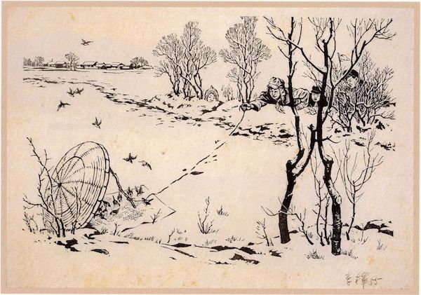 李樺 抓麻雀 黑白木刻 1955年