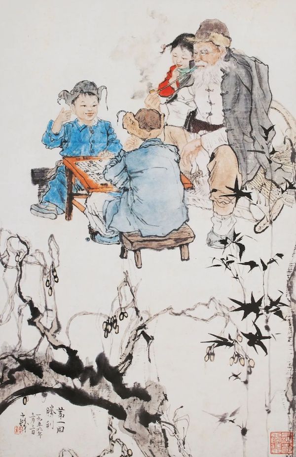 像滾雪球和堆雪人一樣,下棋也是一直延續(xù)至今的一種兒童的游戲方式,而且是一種能夠持續(xù)一生的游樂(lè)方式。程十發(fā)于1958年創(chuàng)作的《第一回勝利》,表現(xiàn)了兩位下象棋的男孩,他們中的一位取得了第一次勝利,旁邊觀戰(zhàn)的爺爺以及他們的姐姐(妹妹)都露出了笑容。