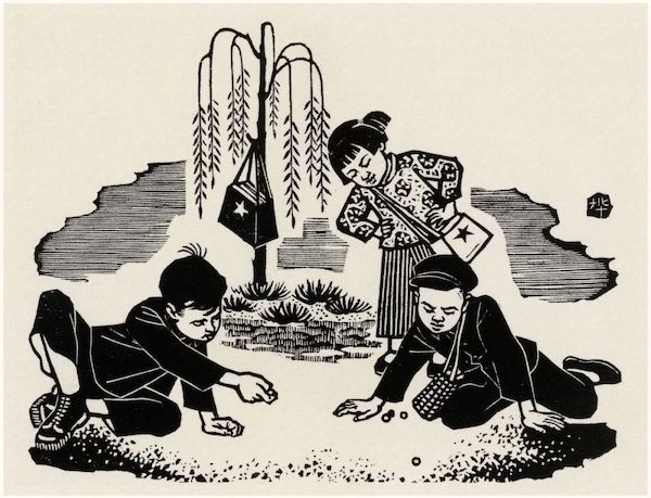 打彈子的游戲經(jīng)常出現(xiàn)在放學(xué)之后,李樺1960 年創(chuàng)作的《放學(xué)后》,所表現(xiàn)的打彈子的游戲是一種一年四季都能玩的最為普及的游戲,只不過(guò)那時(shí)候兒童要得到一枚心儀的彈子也不容易。彈子是玻璃做成的彩花彈,有“獨(dú)花彈”,也有“三花彈”,屬于“彩花彈”;還有“水晶彈”,而“奶油彈”較少。物以稀為貴,“奶油彈”為上品,“水晶彈”次之,“彩花彈”最為平常。打彈子的游戲種類較多,各地玩法也不盡相同,但是,“打”的方式大致相同。畫面中的孩子在放學(xué)后把書包掛在樹(shù)上,在地上打彈子的兩個(gè)孩子的神情是李樺的精心所在,其專注和認(rèn)真吸引了后面觀看的女同學(xué)。李樺帶有裝飾性的藝術(shù)語(yǔ)言,生動(dòng)地表現(xiàn)了兒童的天性,而這與當(dāng)時(shí)其他表現(xiàn)放學(xué)后參加勞動(dòng)的作品有很大的不同,也是當(dāng)時(shí)的一種現(xiàn)實(shí)。