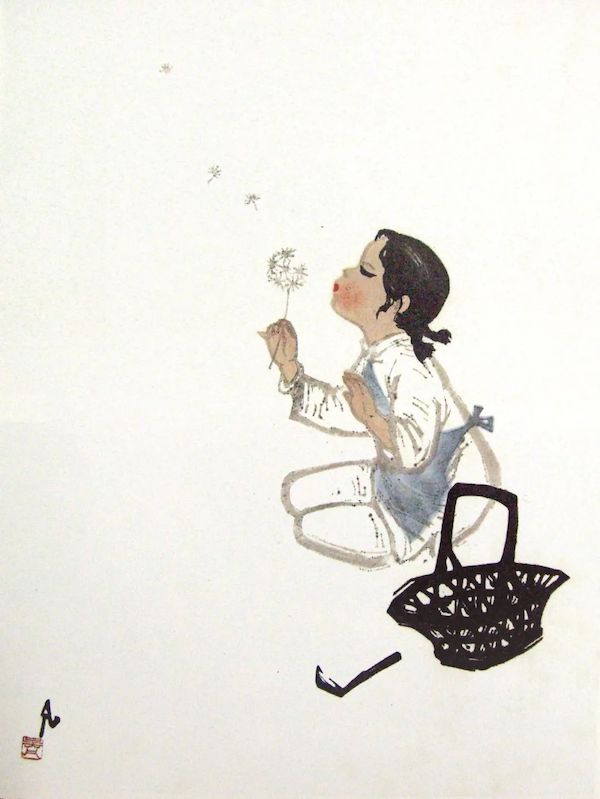 吳凡于1959 年創(chuàng)作的版畫《蒲公英》,是新中國(guó)兒童題材美術(shù)創(chuàng)作的代表作,也是表現(xiàn)兒童在學(xué)習(xí)和勞動(dòng)之外的玩樂(lè)題材的代表作?!镀压ⅰ肥且环N生活中的平常所見(jiàn)。一位身邊有小筐和鐮刀的小女孩,在勞動(dòng)休息的時(shí)候吹蒲公英,自然而生動(dòng),富有生活情趣。可以說(shuō),這是和平年代中的輕歌小調(diào),淺吟低唱。該畫在1959年萊比錫國(guó)際書籍藝術(shù)展覽會(huì)的版畫比賽中獲得金質(zhì)獎(jiǎng)?wù)拢粌H為新中國(guó)贏得了榮譽(yù),也讓人們看到了沒(méi)有政治主題的創(chuàng)作仍然可以表現(xiàn)出時(shí)代的意義。