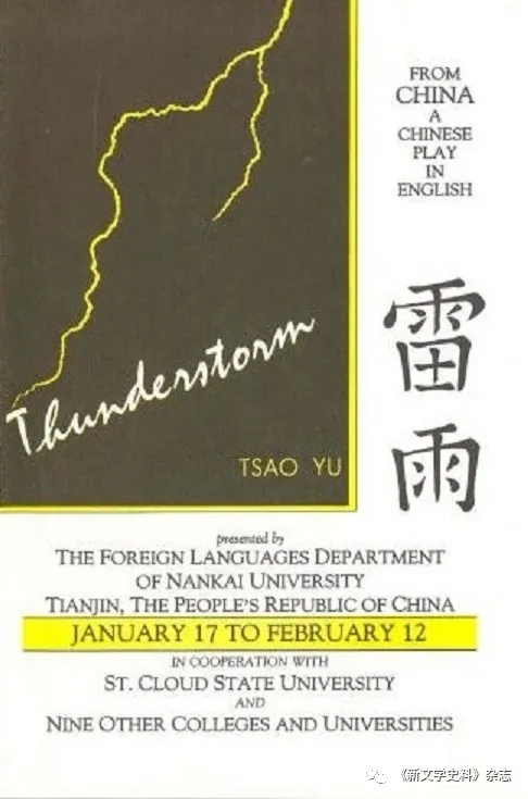 1986年1月,南開大學(xué)外文系英語專業(yè)學(xué)生組成的《雷雨》劇組在副校長王大璲的率領(lǐng)下,赴美國作訪問演出。由費希爾導(dǎo)演的英文話劇《雷雨》在美國演出伊始,他做了一個意味深長的巡演宣傳單(說明),宣傳單上寫道,“南開學(xué)生排演英文話劇《雷雨》的想法來自于他們過去就排演過這出話劇。南開領(lǐng)導(dǎo)和州立圣克勞德大學(xué)校長麥克·唐納德先生通信一起商討了社團這次出國巡演的各項事宜。這是中國第一次派一個大學(xué)生代表團到國外去演出,也是南開話劇團第一次用英語演出《雷雨》。對學(xué)生來說,他們也是第一次離開他們的祖國,而對我來說,這是我真正有過的第一個好主意。對于你們觀眾來說,我們希望你會喜歡由很多中國小演員演出的第一部中國話劇,那些非常優(yōu)雅的表演會使許多人分享他們偉大祖國戲劇的一小部分?!毖莩鰪?月17日開始到2月12日結(jié)束,在將近一個月的時間里,劇團先后在美國明尼蘇達州的州立圣·克勞德大學(xué)(St. Cloud State University)、明尼蘇達大學(xué)德盧斯分校(University of Minnesota-Duluth)、伯米吉州立大學(xué)(Bemidji State University)、摩海德州立大學(xué)(Moorhead State University)、西南州立大學(xué)(Southwest State University)、曼卡托州立大學(xué)(Mankato State University)、威諾那州立大學(xué)(Winona State University)、阿諾卡拉姆齊社區(qū)學(xué)院(Anoka-Ramsey Community College)、明尼蘇達大學(xué)(University of Minnesota)和加州舊金山的斯坦福(Stanford University)10所大學(xué)和學(xué)院共演出了11場英文版《雷雨》,觀眾達4000余人。其中圣·克勞德州立大學(xué)在元月和二月份有兩次演出。出人意料的是演出場場爆滿,可以說演出大獲成功。美國29家英文報刊報道了《雷雨》在美國演出的消息,明尼蘇達州的一家報紙連續(xù)兩天刊登在《雷雨》劇組演出時的照片;《斯坦福時報》發(fā)表評論說:“中國《雷雨》‘襲擊’了斯特靈大廳(斯坦福大學(xué)禮堂)?!?/p>