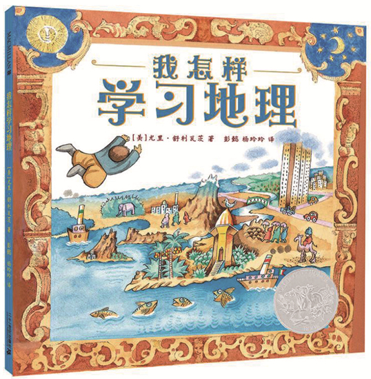 美國作家尤里·舒里瓦茨的繪本作品《我怎樣學(xué)習(xí)地理》的封面,五顏六色,豐富而美好:一個(gè)小男孩在天空飛著,眼中世界繽紛。遠(yuǎn)處高樓林立,河流蜿蜒,白云飄飄;近處城堡古老,椰風(fēng)陣陣,洲島聳立;腳下是蔚藍(lán)海洋,魚兒跳躍,舟船航行;路上騎著駱駝、舉著傘的人們,來來往往,汽車穿梭。