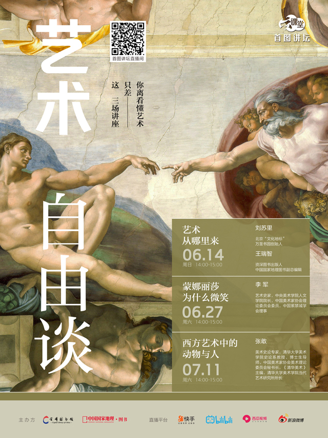 “藝術(shù)自由談”系列講座由北京萬圣書園創(chuàng)始人劉蘇里、“中國國家地理?圖書”副總編輯王瑞智、中央美術(shù)學(xué)院人文學(xué)院院長李軍、清華大學(xué)美術(shù)學(xué)院史論系教授張敢等文化藝術(shù)領(lǐng)域知名專家主講,從奈杰爾?斯皮維的《藝術(shù)創(chuàng)世記》、達(dá)?芬奇的《蒙娜麗莎》、肯尼斯?克拉克爵士的《動物與人》等作品入手,分析人類文明與藝術(shù)之間的復(fù)雜關(guān)系。系列講座包括《藝術(shù)從哪里來》《蒙娜麗莎為什么微笑》《西方藝術(shù)中的動物與人》三場,將從美學(xué)、藝術(shù)史、人文學(xué)等角度剖析世界知名藝術(shù)品,引領(lǐng)讀者走進(jìn)藝術(shù)的美好世界。