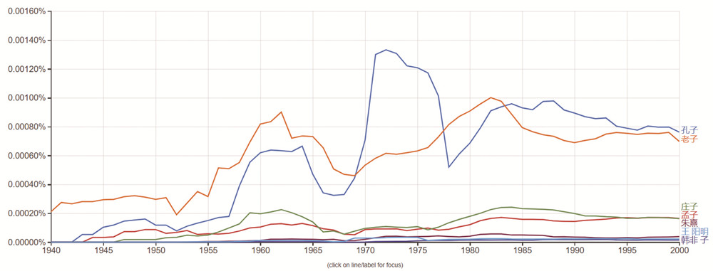 谷歌是人工智能領域的領頭羊,而谷歌圖書中收錄的大量書籍,谷歌搜索中存在的大量網頁文字數據,以及谷歌學術中的學術文字記錄,都為構建這樣一個龐大的語料庫有所助益。它出品的在線工具“Google Ngram viewer”主要基于谷歌圖書的語料庫,方便展現不同語詞在歷史上的整體變化。通過輸入想要查找的關鍵詞,便可以看到在相關語料中,隨著歷史發(fā)展,相關詞語的變化趨勢。例如,筆者將時間限定為1940-2000年,鍵入孔子、孟子、老子、莊子、朱熹等中國歷代思想家,可以發(fā)現,它們歷年在數據庫中的權重變化,這一數據顯示,孔子無疑是最有熱度的思想家,與學者和相關論者的思想勾連也最為密切。