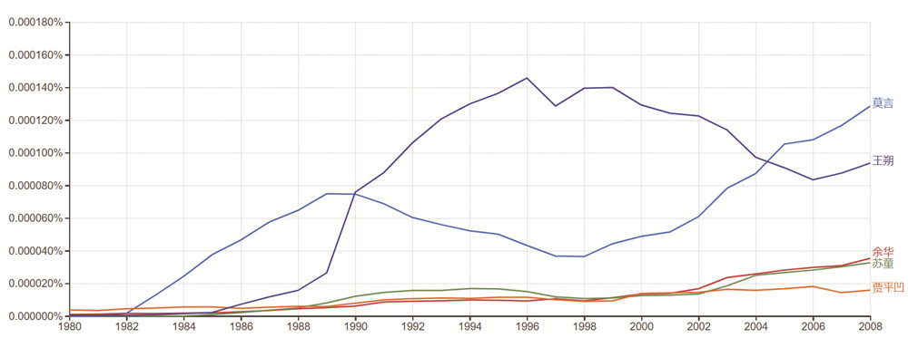再如,可以選取幾位當代作家,如莫言、余華、王朔,觀察自1980年代以來,在紙質書數據庫中他們的權重走勢。