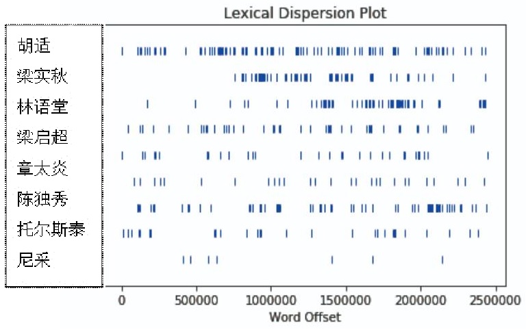 同樣,也可用它對中文文本進行研究,例如,某些特定的人名在作家魯迅的文本中的分布狀況如何呢?筆者采用python中的nltk模塊繪制了如下分布圖。
