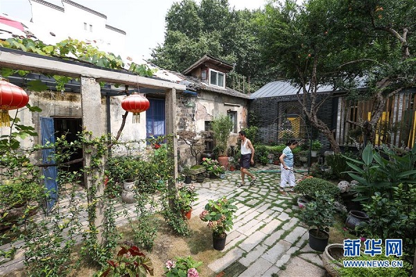 堆草巷居民劉光紀(jì)(左)與老伴在“共享院落”里整理花木(7月1日攝)。他們把自家接近100平方米的后院對(duì)外開(kāi)放,成為公共開(kāi)放空間。新華社記者 楊磊 攝