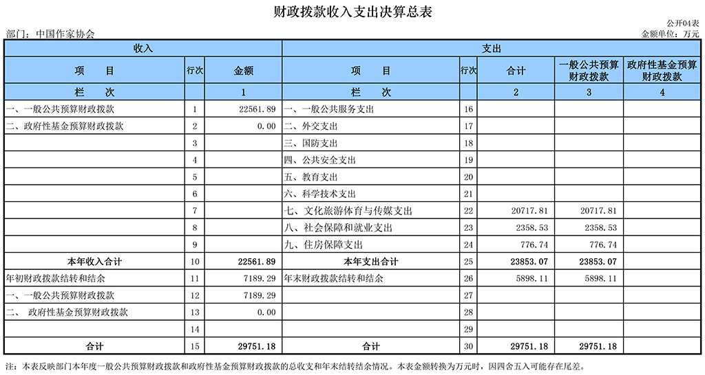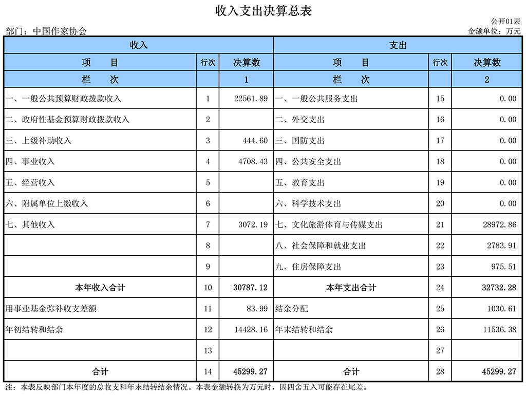 中國(guó)作家協(xié)會(huì)2019年部門(mén)決算包括中國(guó)作協(xié)本級(jí)決算及所屬11個(gè)事業(yè)單位決算,同比不變。