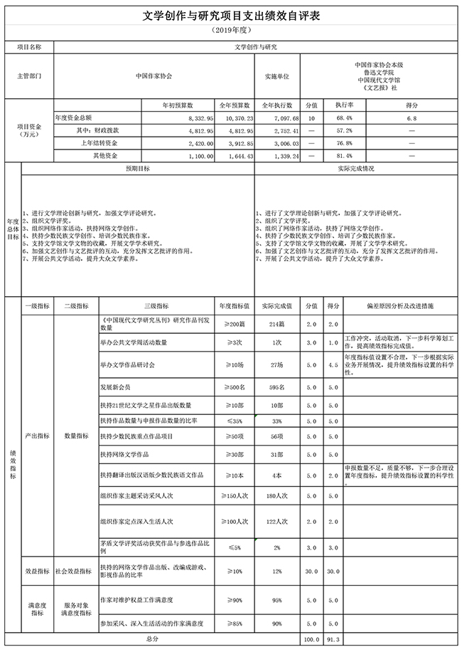 1.“文學(xué)創(chuàng)作與研究項(xiàng)目”績(jī)效自評(píng)綜述:根據(jù)年初設(shè)定的績(jī)效目標(biāo),項(xiàng)目自評(píng)得分為91.3分。項(xiàng)目全年預(yù)算數(shù)10370.23萬(wàn)元,執(zhí)行數(shù)為7097.67萬(wàn)元,完成預(yù)算的68.4%。項(xiàng)目績(jī)效目標(biāo)完成情況:組織多批作家深入生活,舉辦公共文學(xué)活動(dòng),茅盾文學(xué)獎(jiǎng)評(píng)獎(jiǎng),文學(xué)作品扶持;扶持了少數(shù)民族文學(xué)和網(wǎng)絡(luò)文學(xué)創(chuàng)作;支持了文學(xué)館文學(xué)文物的收藏;開(kāi)展了文學(xué)學(xué)術(shù)研究,加強(qiáng)了文藝創(chuàng)作與文藝批評(píng)互動(dòng),充分發(fā)揮了文藝批評(píng)的作用;進(jìn)行了文學(xué)理論創(chuàng)新與研究,加強(qiáng)了文學(xué)評(píng)論研究。發(fā)現(xiàn)的問(wèn)題及原因:一是年初設(shè)置的個(gè)別指標(biāo)不合理;二是部分二級(jí)項(xiàng)目執(zhí)行進(jìn)度較慢。下一步改進(jìn)措施:增強(qiáng)指標(biāo)設(shè)置的科學(xué)性,加快預(yù)算執(zhí)行進(jìn)度,提升文學(xué)工作的開(kāi)拓性與創(chuàng)新性。