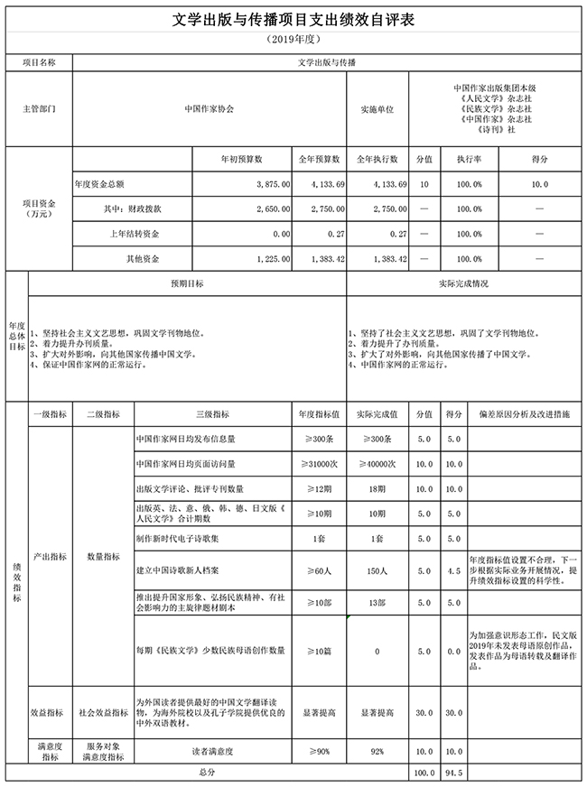 2.“文學(xué)出版與傳播項(xiàng)目”績(jī)效自評(píng)綜述:根據(jù)年初設(shè)定的績(jī)效目標(biāo),項(xiàng)目自評(píng)得分為94.5分。項(xiàng)目全年預(yù)算數(shù)4133.69萬(wàn)元,執(zhí)行數(shù)為4133.69萬(wàn)元,完成預(yù)算的100.0%。項(xiàng)目績(jī)效目標(biāo)完成情況:堅(jiān)持了社會(huì)主義文藝思想;鞏固了主要文學(xué)刊物的主導(dǎo)地位,著力提升了辦刊質(zhì)量;擴(kuò)大了中國(guó)文學(xué)的對(duì)外影響,向其他國(guó)家傳播了中國(guó)文學(xué);中國(guó)作家網(wǎng)正常運(yùn)行。發(fā)現(xiàn)的問(wèn)題及原因:一是部分績(jī)效指標(biāo)設(shè)置不合理,不利于績(jī)效評(píng)價(jià)和實(shí)際工作的開(kāi)展,預(yù)算執(zhí)行過(guò)程中完成難度較大;二是文學(xué)刊物的質(zhì)量需要進(jìn)一步提高。下一步改進(jìn)措施:增強(qiáng)對(duì)于績(jī)效指標(biāo)科學(xué)性的設(shè)置,根據(jù)項(xiàng)目目標(biāo)要求和實(shí)際工作開(kāi)展情況,設(shè)置合理的績(jī)效指標(biāo),著力提升文學(xué)刊物的創(chuàng)新性。