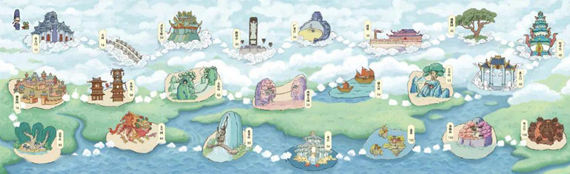 這本書大致按照“天界”、“人界” 、“地界”三部分的圖景劃分,一共是22處西游景點(diǎn),三個(gè)空間獨(dú)立卻又承前啟后,極其詳盡。比如天界的相關(guān)介紹,南天門、凌霄寶殿、廣寒宮這些地點(diǎn)西游迷們也不陌生,但是四大天王的法器和能力,天河中的珍奇神獸,《霓裳羽衣曲》的來歷大家卻未必清楚。數(shù)百位神話人物,恢弘壯麗的神話場(chǎng)景,是“西游”卻又非“西游”。通過對(duì)古典名著的再創(chuàng)作,不僅精準(zhǔn)還原了原書中的故事,又進(jìn)行了合理的升格。